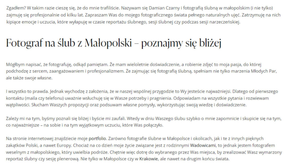 Fragment landing page dla fotografa ślubnego – pozycjonowanie lokalne.