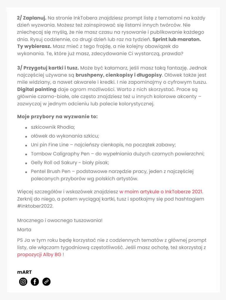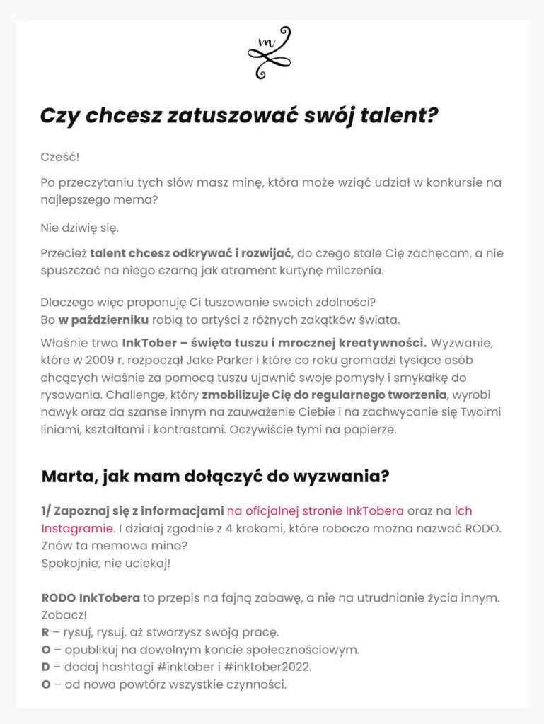 ► Budowanie relacji z subskrybentami. Tworzenie wartościowych treści (case studies, wyzwania takie jak InkTober), które angażują subskrybentów i budują wizerunek Marty jako autorytetu, który prowadzi za rękę.
