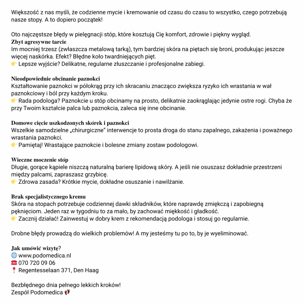Marka łączy medyczną precyzję z misją edukacyjną, pokazując, że stopy potrzebują czegoś więcej niż tylko codzienne mycie. Podomedica, to jeden z kilkunastu klientów, dla których tworzyłam treści w czasie 2,5-letniej współpracy z agencją marketingową Marketing To Podstawa.